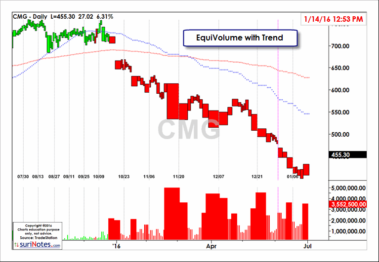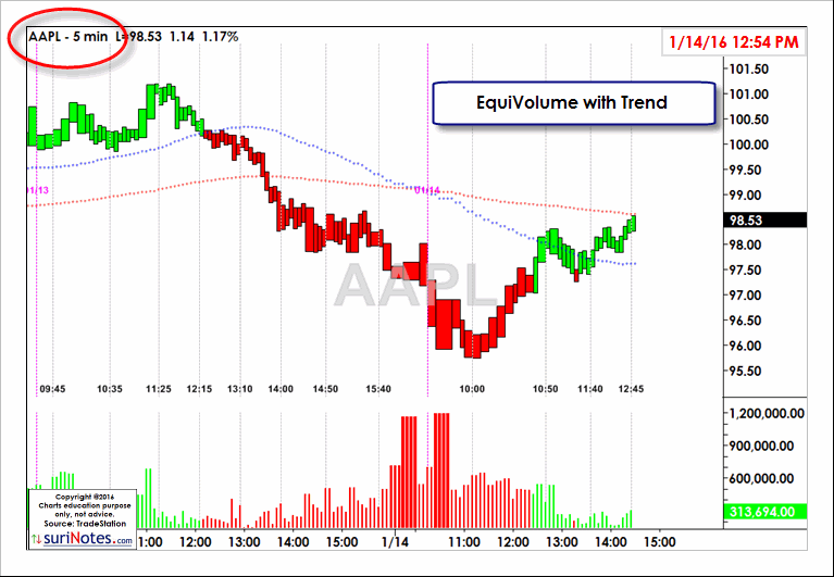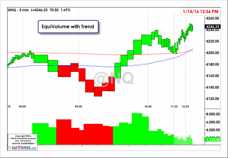 EquiVolume charts incorporate Price and Volume and displays the Candlestick type of charts.suriNotes EquiVolume charts also display the underlying trend gives which adds a signficant advantage along with Price, Volume and underlying trend. Trend display can be optionally selected to turn off/on or plot the actual price-action in bar or candle chart format. EquiVolume charts can be plotted on all time-frames and in all instruments. It also plots (optionally) Volume and 2 Key Moving Average displays in any TradeStation chart.