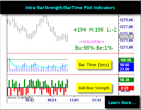 IntraBar Execution Tools (BarStrength and BarTime Plot) help to enter into trades selectively and avoid Chop and Hesitation Trading Zones. BarStrength indicator shows the TICK Countdown, TickDifference (Highest, Lowest) and shows the Bullish/Bearish Tick Charts within a Bar while the Highest Positive Ticks and Negative Ticks. BarTime Plots Shows the each bar time in Seconds to complete. It plots these counts and graphs in Real-time. BarTime also computes TickTime Historic time in seconds