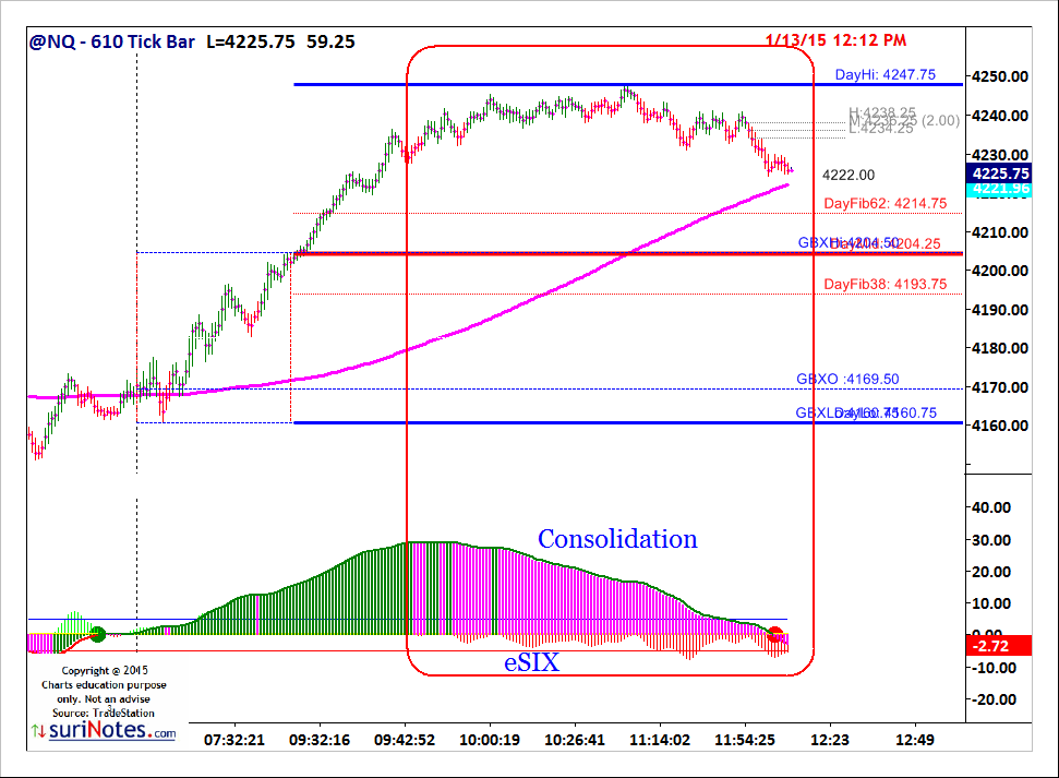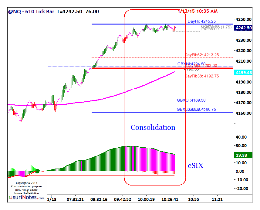 suri.eSix is a Trend based indicator which uses 6 non-correlated trend models and builds a uniform trend. eSIX plots in a Sub-Graph showing the bullish and bearish trends. eSix trend can be also used to spot the divergences in underlying trend. eSIX works both in Charts and RadarScreen.